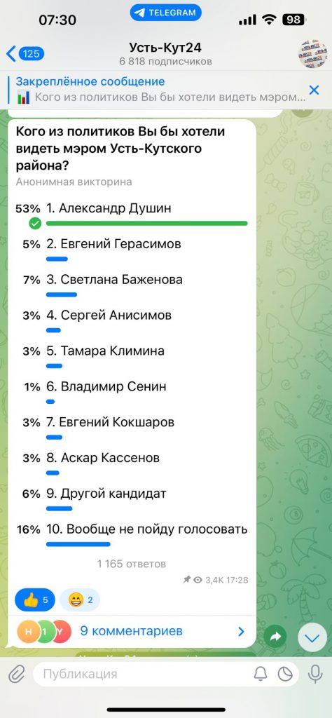 За 5 дней до начала голосования стало однозначно известно, что у действующего мэра Анисимова, нет абсолютно никакой электоральный поддержки среди местного населения. Даже в социальных сетях и мессенджерах, за него топят исключительно проплаченные ИНК тролли, не имеющие к нашему району никакого отношения. Нет никакой социальной группы избирателей в Усть-Куте, которая бы была фанатом действующего мэра. Вся надежда у команды Анисимова, это подкуп и подвоз избирателей все три дня голосования. Если население мобилизуется и придет на участки, победа