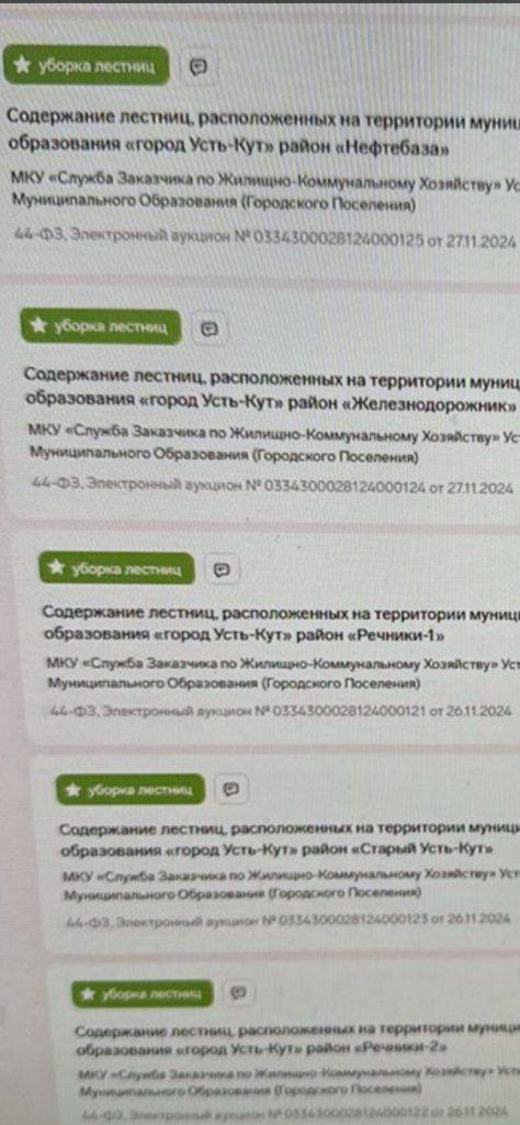 Как удалось установить «УК24», муниципальные  контракты на обслуживание лестниц в Усть-Куте, заключили две формочки из Иркутска. ООО «Иркутскпромснаб», директор Илья Кузнецов и ООО «Ремсторйград», директор Тимур Выпряжкин. При чем во время аукциона явно демпинговали и снизили цену аж в два раза от заявленной. По итогу получили  годовой контракт на обслуживание всех городских общественных лестниц, но работать вообще не спешат.