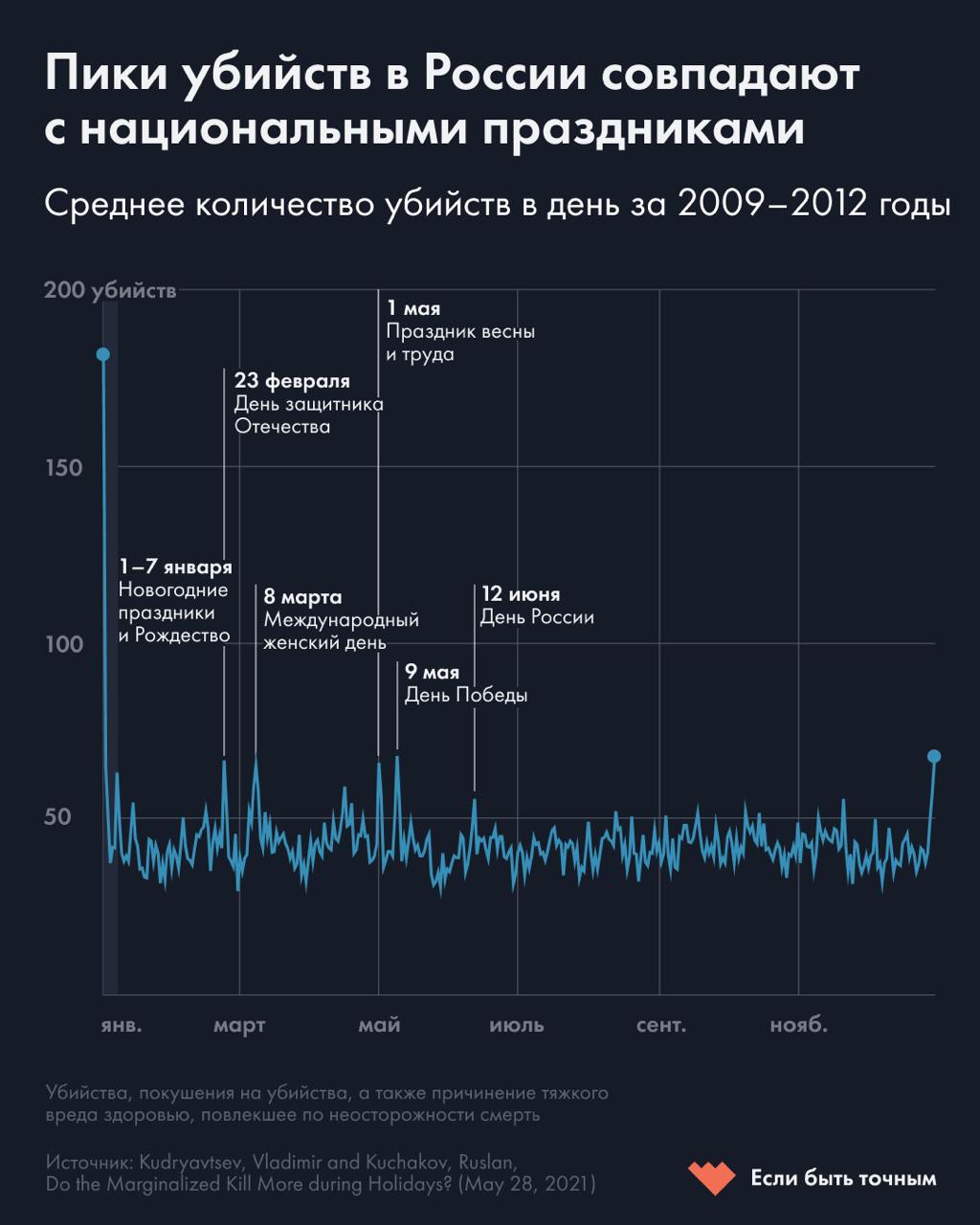 Еще в праздники чаще убивают. Если в среднем в обычный день происходит 40-50 убийств, то 23 февраля, 8 марта, 1 и 9 мая — 65-70, а 1 января их число возрастает до 170-180.