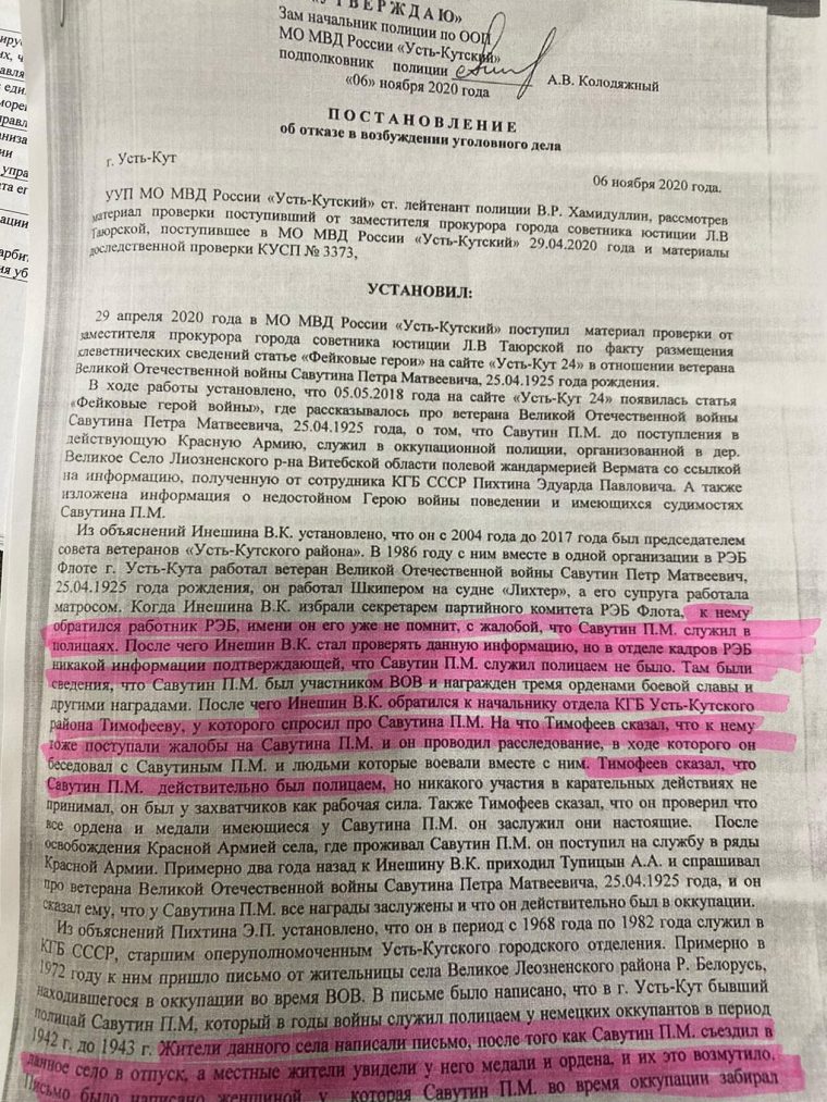 Как и обещали, каждый год будем к празднику публиковать эту статью про фейкового ветерана войны из Усть-Кута. В последнее время очень много обсуждений в публичном пространстве о людях, выдающих себя за ветеранов и участников войны, хотя многие из них в силу возраста не могли быть призваны в армию. Самому молодому ветерану призванному в войска например в январе 1945 года, сегодня должно быть не менее 98 лет. После публикации книги Светланы Константиновны Пшенниковой, о ветеранах войны из Усть-Кутского района, в редакцию «УК24» пришло письмо из села Великое, Лиозненского района Витебской области Белоруссии от наших читателей, которые рассказали нам о драматической и криминальной истории, связанной с уроженцем их села и жителем нашего города случившиеся в послевоенное время. События начались в начале войны в 1941 году, когда житель села Великое, Савутин Петр Матвеевич, 1925 года рождения, не попал под мобилизацию в Красную Армию в силу возраста, и через месяц оказался на долгих три года на оккупированной фашистами территории. 16-летний Петр был человеком смышленым и умел приспосабливаться, и поэтому не пошел как многие его односельчане в сопротивление к партизанам, а поступил на службу в оккупационную полицию, организованную в родном селе полевой жандармерией Вермахта. В силу юного возраста, недюжей силы и роста под 2 метра, Петр быстро стал продвигаться по карьерной лестнице коллаборационистов, и уже через год самостоятельно проводил мероприятия по выявлению недовольных оккупантами односельчан. Еще через год доверие к молодому полицаю у начальства возросло до того, что его как агента внедрили в партизанский отряд в соседнем районе и полицай Петр в скором времени раскрыл его местоположение и структуру связи своему начальству, в следствии чего партизанский отряд был почти полностью уничтожен немецкими карательными частями. Неизвестно, до каких карьерных вершин, смог бы дорасти коллаборационист Савутин, если бы части Красной Армии не освободили родное село в марте 1944 года. Естественно, что бывший полицай был вынужден ретироваться в другой район, чтобы не быть повешенным как пособник оккупантов, а такое возмездие в то время часто практиковалось на освобожденных территориях. Тем не менее, оказавшись человеком не глупым и поняв, что оставшись в родных краях он рискует неизбежно попасть в руки СМЕРШа, Петр Савутин добровольно приходит в полевой военкомат и записывается как подлежащий призыву гражданин СССР в войска наступающей армии. Правда, перед этим он меняет себе год рождения на 1922 и берет место рождения своего знакомого из Челябинской области. Во вновь сформированной военной части Петр Матвеевич в ввиду красивого и каллиграфического почерка становиться писарем, а через некоторое время на него посыпался звездопад из наград самого высокого номинала. Как ни странно, но на каждом наградном листе написанным писарем Савутиным и утвержденного комадованием, в самом конце списка оказывалась фамилия самого писаря и к маю 1945 года бывший полицай стал полным кавалером орденов Славы трех степеней, кавалером медалей «За боевые Заслуги», «За Отвагу» и ордена Красной Звезды, а так-же еще многих менее ценных наград. Ожидаемо, что после войны он один из первых ушел на демобилизацию без единого ранения и уехал на ПМЖ, в места далекие от его род