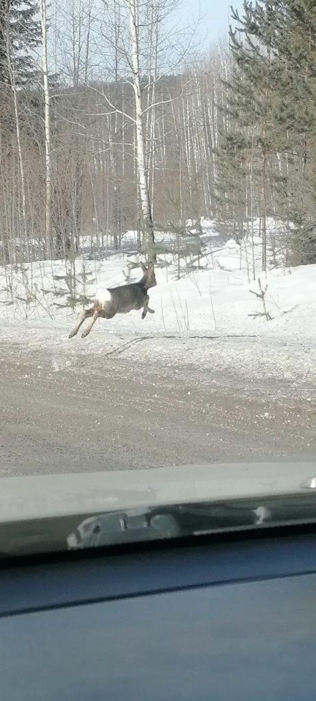 Недалеко от села Каймоново Усть-Кутского района, наши подписчики засняли перебегающую дорогу косулю